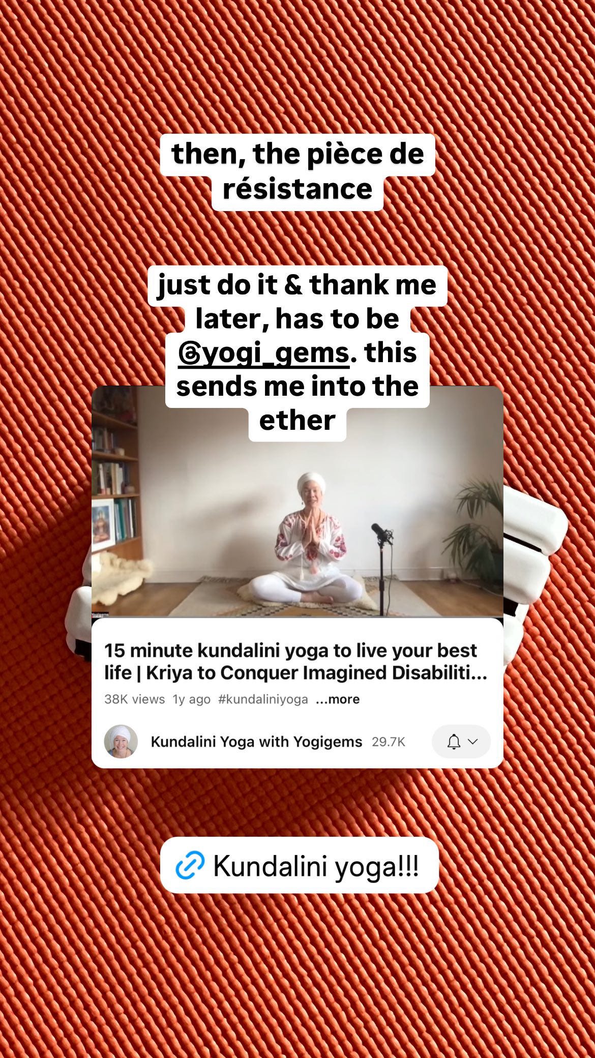 Then I move to the gem of the routine, no pun intended, Kundalini Yoga with Yogi Gems. Kundalini Yoga is the gift that keeps on giving and giving and giving- rapid arm movements & breathwork combine to release stagnant energies & emotions while grounding and centering the mind & body.