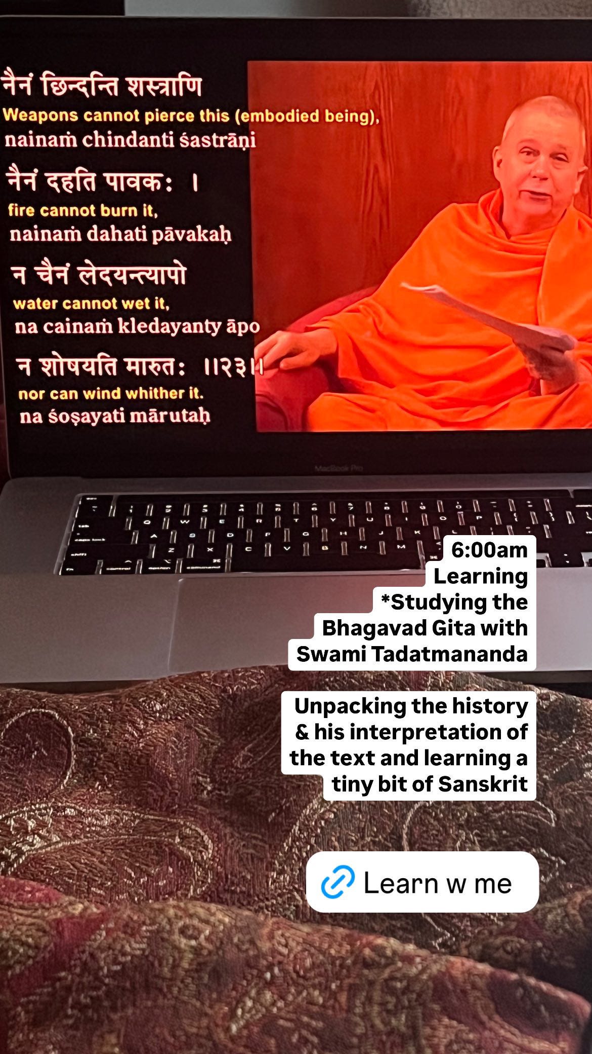 Studying the Bhagavad Gita with Swami Tadatmananda. Unpacking the history & his interpretation of the text and learning a tiny bit of Sanskrit.